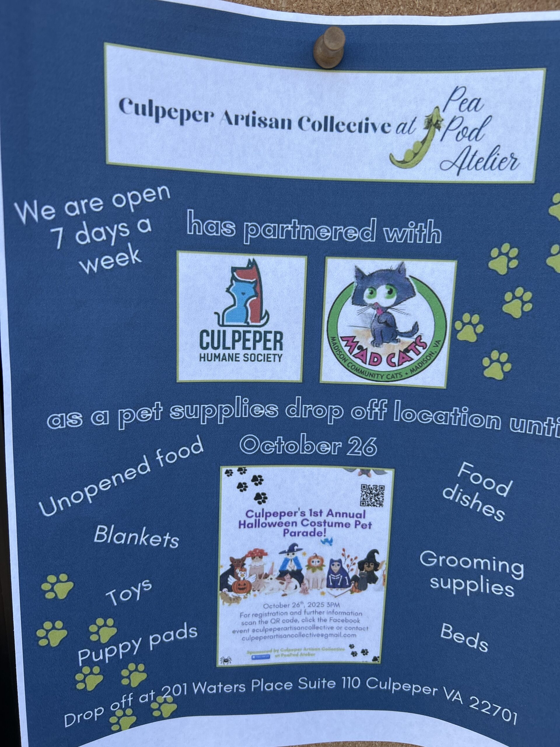 Culpeper Artisan Collective is partnering with MadCat and Culpeper Human Society to help pets in needs A drop off point is set up at their shop. All pet supplies, food,... Read more »