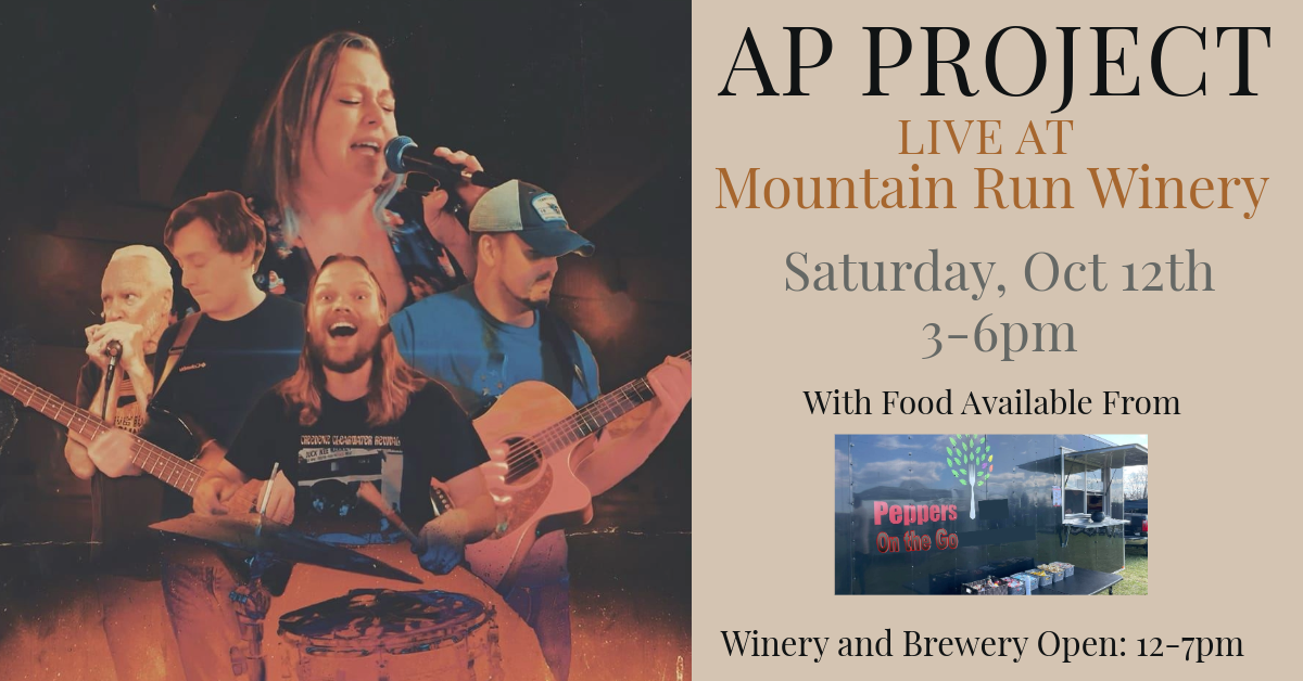 Mountain Run Winery 10753 Mountain Run Lake Rd, Culpeper, VA, United StatesCome out October 12th and enjoy the fall with us at Mountain Run Winery. Grab a glass of wine cider or beer and listen to local musicians AP Project playing from 3-6. Hungry? We've got that covered as well with Pepper's on the Go food truck onsite all day as well. If you haven't heard... Read more »