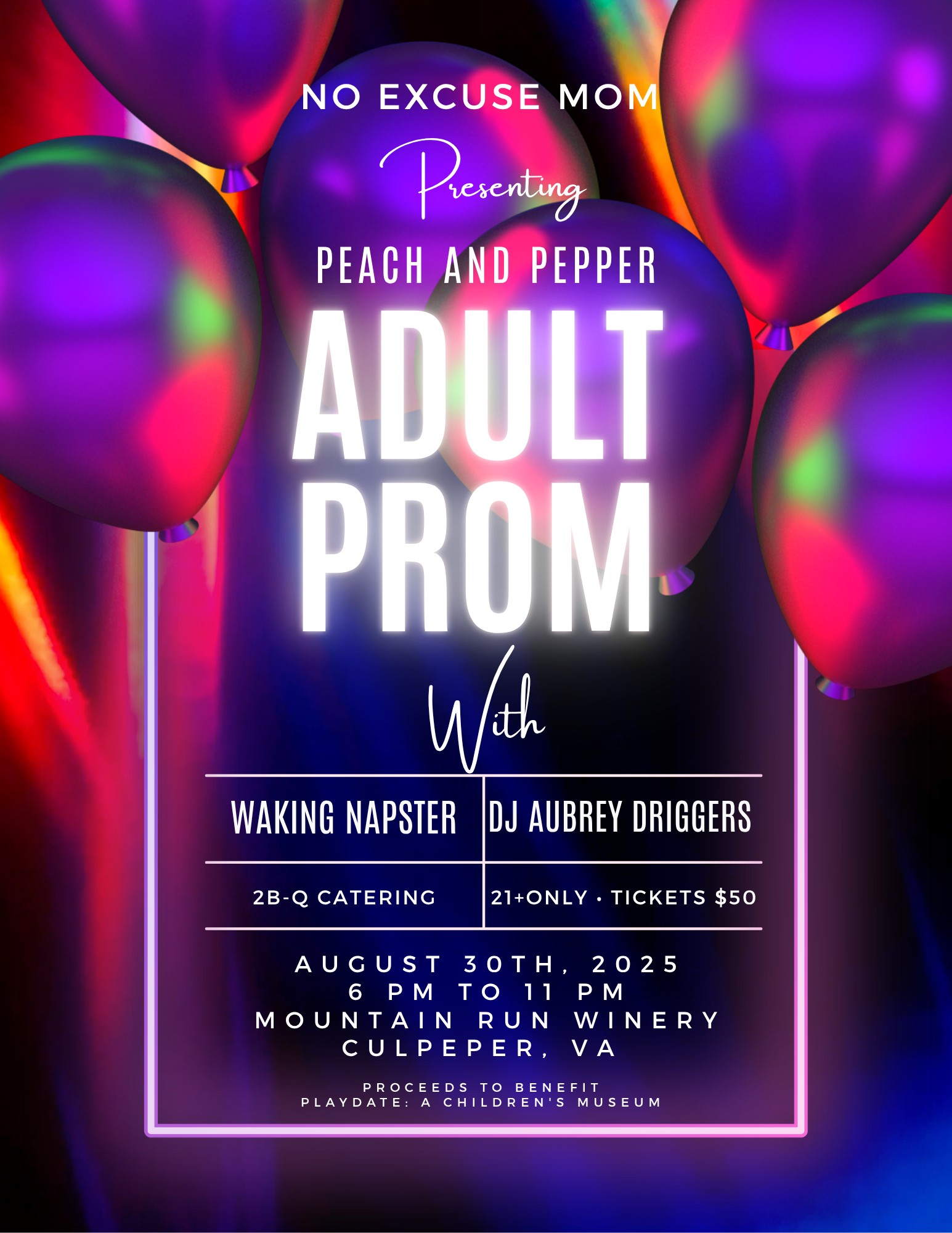 Mountain Run Winery 10753 Mountain Run Lake Rd, Culpeper, VA, United StatesBACK BY POPULAR DEMAND! It's time for an unforgettable night of dinner, dancing, and good times No Excuse Mom is hosting the Peach and Pepper Adult Prom Fundraiser with proceeds going to local non-profit PlayDate: A Children's Museum. This event will feature Waking Napster playing 90's & 00's alternative rock hits during cocktail hour followed... Read more »
