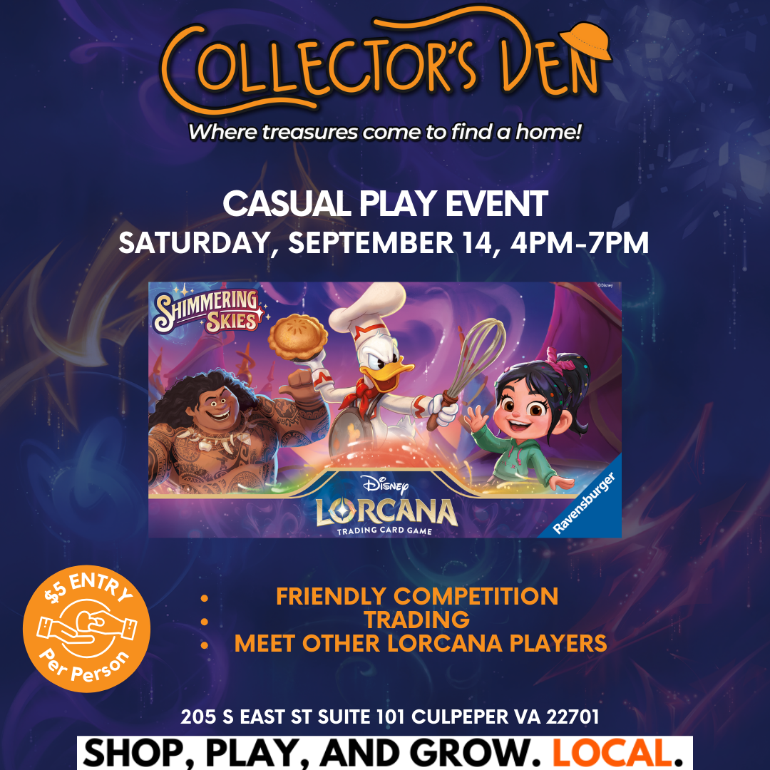 Collector's Den 205 S East Street Suite 101, Culpeper, VA, United StatesExperience the Magic at the Wizard Weekend Potion Workshop! Dates: Saturday, July 26th & Sunday, July 27th Location: 205 S East Street Suite 101, Culpeper, VA 22701 Tickets: $20 Step into the enchanting world of Hogwarts and unleash your inner wizard! Join us for this magical workshop where each participant will receive: A pair of... Read more »