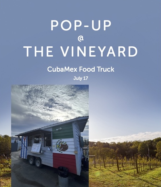 CubaMex will be at the Vineyard on Thursday, July 17th, from 5 - 7:30 pm, serving authentic, homemade Cuban and Mexican cuisine. Join us for dinner!